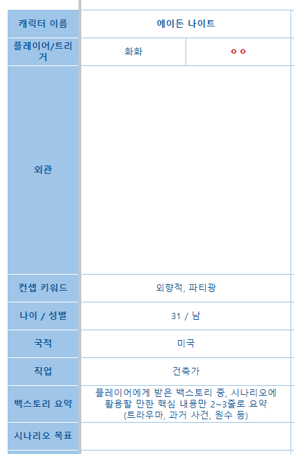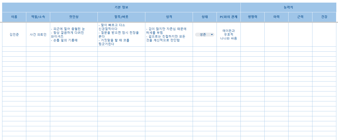플레이어 캐릭터의 백스토리, 목표 등을 기록하여 맞춤형 플레이를 돕습니다.