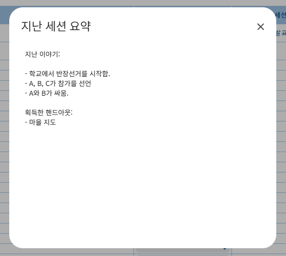 세션 로그에서 체크된 항목들을 모아 '지난 이야기' 요약문을 만들어줍니다.